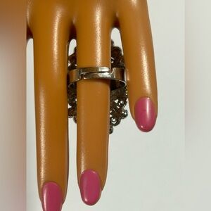 Captivate every room with a piece designed to catch the light and hold the gaze. This stunning cocktail ring features a mesmerizing array of peridot and emerald-toned crystals, meticulously set in an intricate silver-tone filigree gallery.