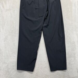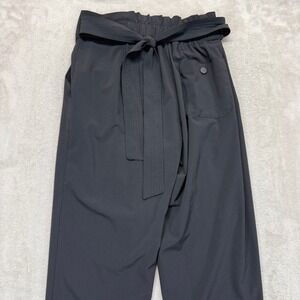 Athleta Skyline pants in black. These pants feature a high-rise waist with a flattering pleated front and a comfortable elasticized waistband. Equipped with a zip closure pocket on the left hip and a belt detail at the waist. The silhouette offers a relaxed fit through the leg.