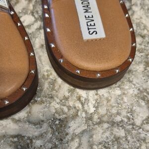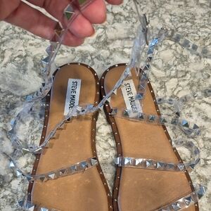 Chic Steve Madden sandals with clear straps and silver studs. Ideal for stylish outings. Wrap around ankle style.