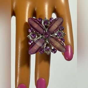 There is a specific kind of magnetism that comes with the right accessory. This stunning statement ring features deep amethyst-toned crystals arranged in a masterful floral architecture. It doesn’t just complement an outfit; it commands the conversation.