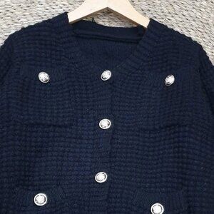 Navy Chunky Knit Double Breasted Silver Button Crop Cardigan