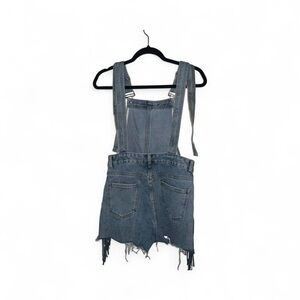 Stylish distressed denim overalls with frayed edges. Perfect for casual wear or add a pair of boots for a cowgirl look.