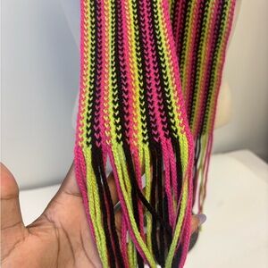 Add a pop of color to your outfit with this vibrant striped scarf. Perfect for any season.
