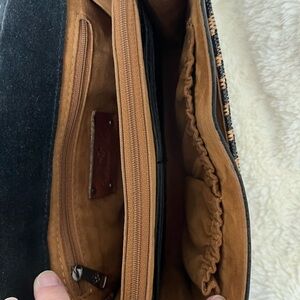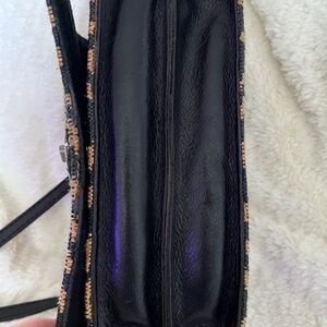 Stylish Patricia Nash handbag with intricate black and brown weave. Suede interior with inside card holders, pouches and two zipper pockets. Includes authenticity card. Minor corner rubbing and small strap thread loosening near snap as shown in picture. Very lovely vintage bag. Turlock closure