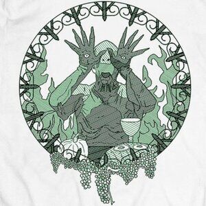 Step into a world of dark mysticism with this striking green occult-inspired graphic T-shirt. Featuring a detailed ritual-style illustration framed in an ornate circular design, this artwork blends gothic, fantasy, and esoteric aesthetics into one bold statement piece.