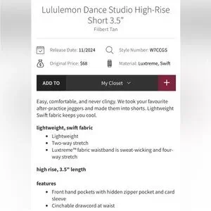 lululemon High Waist Dance Studio Filbert Tan Shorts 8