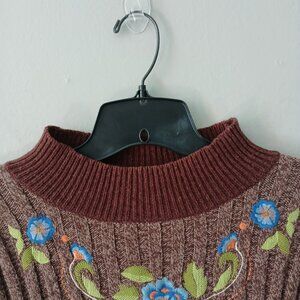 The Sundance Women's Sweater in size small is a stylish and versatile pullover featuring floral embroidery, a mock neck, and long sleeves. Made from a blend of polyester, silk, nylon, cotton, wool, and acrylic in a tight-knit fabric, this sweater is perfect for travel and casual occasions during the winter and fall seasons. The brown color and pleated accents add a touch of bohemian flair to the classic and preppy design, making it a must-have addition to any woman's wardrobe.