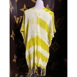 Bright yellowish green gauze like cover up made of a lightweight knit fabric and gathers at the waist with a tie and has a fringed bottom.