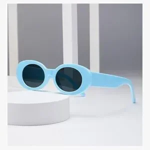 Trendy oval sunglasses in a vibrant blue shade. Perfect for a chic retro look.