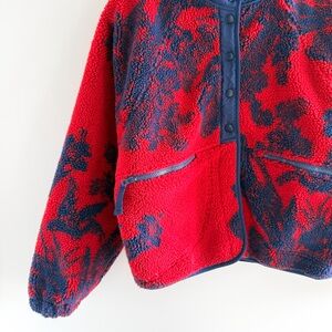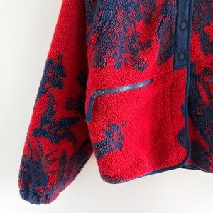 Vibrant red and navy design. Cozy teddy texture. Button-up front. Stylish high collar.