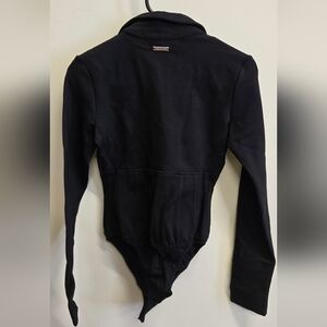 Chic black bodysuit with deep V-neck. Features a stylish front zipper. Thick quality fabric.