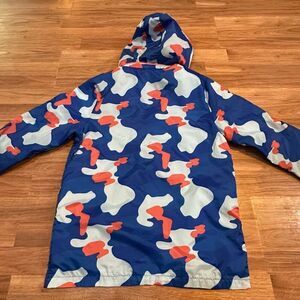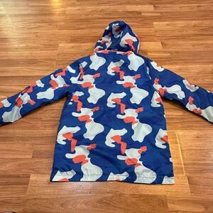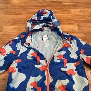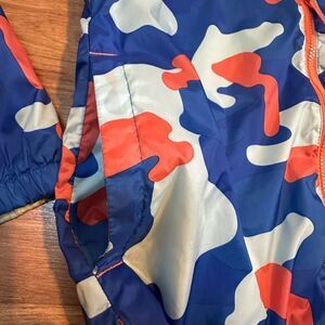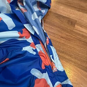 This is a zip up jacket with a hood. The hood can be zipped back up to hide in the neck. Very lightweight. Great for Summer. Blue and orange camouflage design. Has front pockets. Pre-owned-Excellent condition.