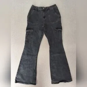 Forever 21 Premium High Rise Black Denim Cargo High Rise Flared Jeans Size 30