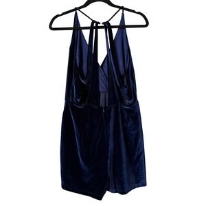 Rich navy blue velvet romper from Urban Outfitters in size Medium. Flattering wrap V-neck front with a dramatic strappy open back — perfect for upcoming fall/winter party season, holiday events, New Year's Eve, cocktail nights, and dressy going-out looks. Fully lined, soft stretch velvet, made in USA. Zip back closure.