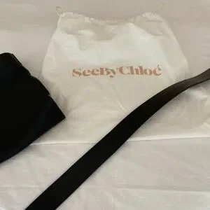 Like New! Only used twice. See by Chloe Joan Leather Shoulder Bag Black + Front is embellished with the line's signature feminine braided O-ring with the key and medal. Features a removable strap for multiple carry options.+ calf leather + gold-tone hardware + ring hardware detailing + Key pendant charm + Snap tab closure + Removable shoulder strap + Wide Single shoulder strap + Double flat top handles + Interior slip pocket + Calf Leather 100% Lining: Calf Leather 100%, Suede lining + CHS23USBD30001 + Retail: $695 » 14"W x 3.25"D x x 11.5”H, 3" double handle drop, 21” Strap Drop »❤️