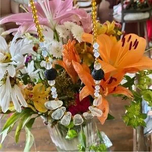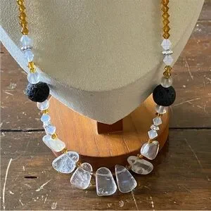 Stranded on jewelers string with Amber color and quartz pieces
