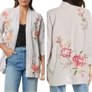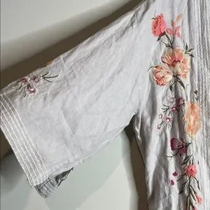 Johnny Was | Vienna Linen Light Gray Floral Embroidered Kimono Top Size XL NWT