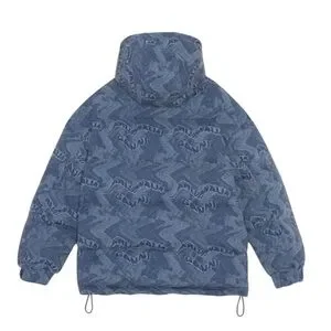 Printed Laser Denim Puffer Printed Laser Denim Embroided Puffer Jacket In Blue