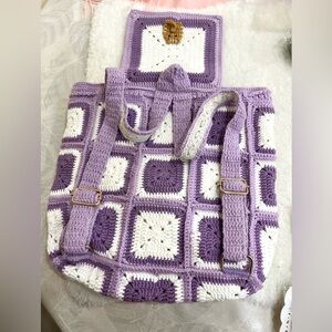 Charming new crochet backpack featuring a playful cat design. Crafted in purple and white, this bag adds a whimsical touch to any outfit. Perfect for cat lovers and those who appreciate unique accessories.
