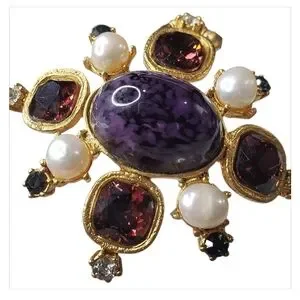 High Domed Amethyst Glass Center Cabochon with Swarovski Crystals and Beautiful Pearls