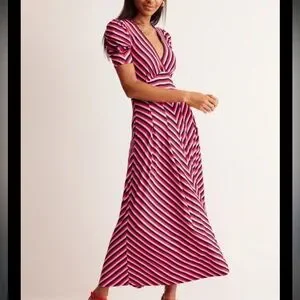 The Boden Kristen Stripe A-line dress features bold stripes that accentuate the A-line silhouette of this swingy and sophisticated stretch-jersey dress. It has a surplice V-neck, short sleeves, and is partially lined. This dress is made from 95% Lenzing™ EcoVero™ viscose, 5% elastane, and is machine washable.