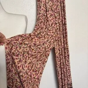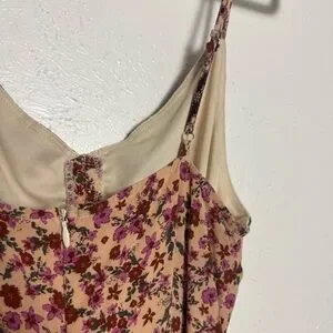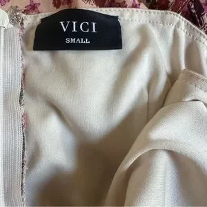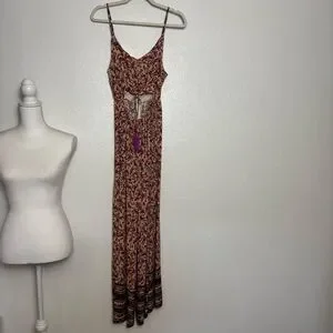 Elegant Vici dress with floral pattern. Features a sleeveless design and subtle cutout. Tassels & adjustable straps. Triangle chest. Wide leg. Measurements laying flat are approximately Chest- 17 Waist- 14 Inseam- 28