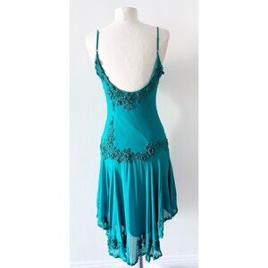 Vintage Y2K Prom Dark Teal Turquoise Crochet Floral Backless Midi Silk Dress