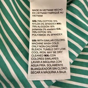 Chico’s Green and White Diagonal Stripe Blouse 3 Button Shoulder Detail