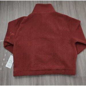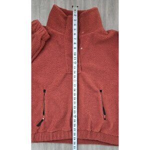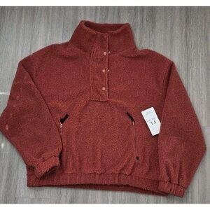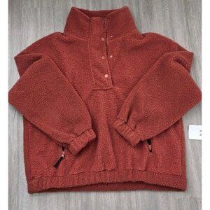 Vital Life Sport women’s sherpa fleece pullover in a warm terracotta color. Features a cozy mock neck with half snap button closure and two side zip pockets. Soft and comfortable fleece material, ideal for casual wear or outdoor activities during fall and winter.