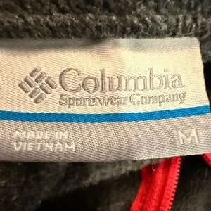 Columbia jacket featuring a gray body with red accents. Medium size. Made in Vietnam.