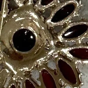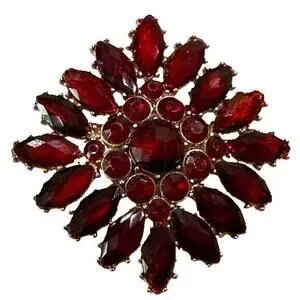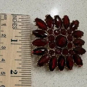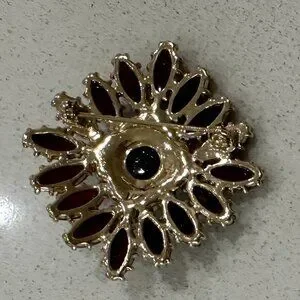 LC Brooch featuring red marquise and round shape acrylic prong set stones arranged in a starburst or flower pattern