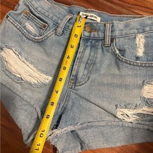 Billabong light wash denim cutoff shorts with distressed details and raw frayed hem.