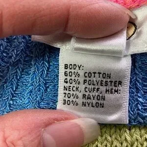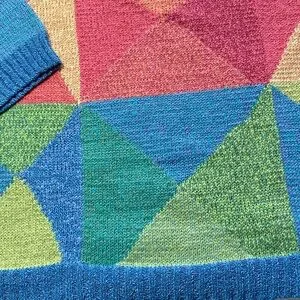 Vibrant sweater with geometric design. Features a mix of blue, pink, yellow, and green. Perfect for a bold look.