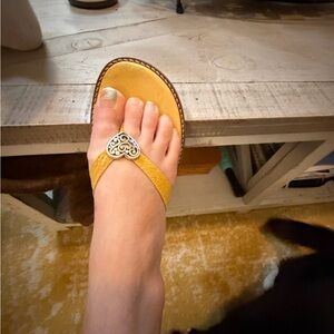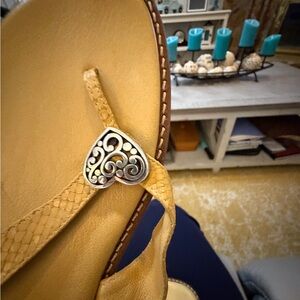 Brighton sandals in vibrant yellow. Features a silver heart accent. Perfect for casual wear. Orla size 10M leather and snake skin design straps. Excellent condition