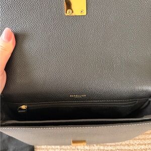 This elegant handbag features a sleek black design with striking gold accents, perfect for any occasion. Its sophisticated style makes it a must-have accessory.