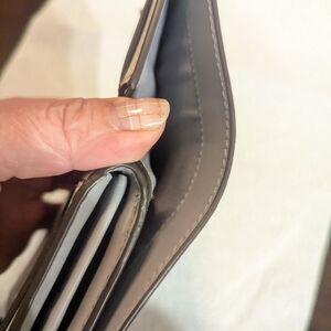 Tory Burch light gray Robinson pebbled leather billfold wallet.