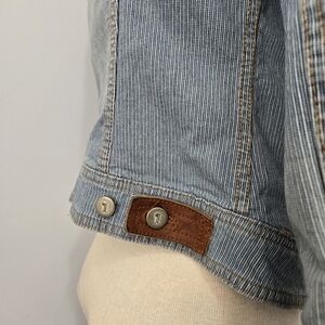 Adorable denim jacket with a railroad stripe. Full button closure. Two chest and two bottom pockets.