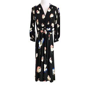 NWOT MASSIMO DUTTI BLACK FLORAL FRONT-KNOT MIDI DRESS STYLE 6643, this is a chic spring inspired black and white floral print - v-neck long sleeve midi dress in a 100% viscose sultry flowy fabric with a front tie-knot at the waist for a tailored and flattering touch for the silhouette - snap button on the neckline to keep it safely closed - collarless - unlined - long sleeves with gathered cuffs - side zip - perfect for work and night out, first date, fancy dinner at a restaurant, birthday party or a baby shower / gender reveal - easy to dress up or down with a white sandal or just ballerina flats for a more modest touch.