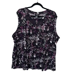 Women's plus size sleeveless tank top by Any Wear by Catherines. This top features a striking abstract print in shades of purple black and white. A stylish mesh inset at the neckline adds a touch of modern flair. Perfect for casual outings or a relaxed evening.