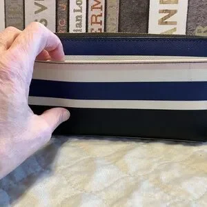 NWOT KATE SPADE Blake Avenue Printed Neda Wallet - Bon bon stripe. Kate spade fabric logo inside. Cream, blue and black. 4x8