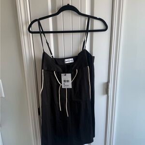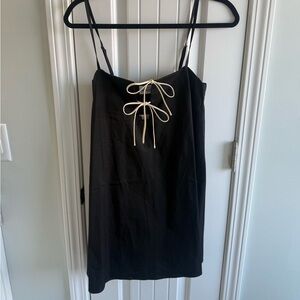 Stylish black mini dress. Features a cream bow accent. Ideal for versatile wear.