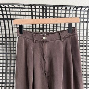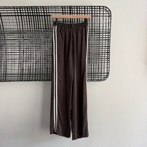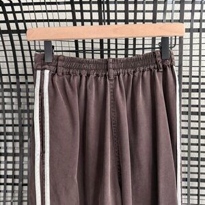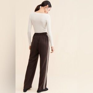 High-rise striped pants in wide leg silhouette w/ pleating at the front and elastic at the back