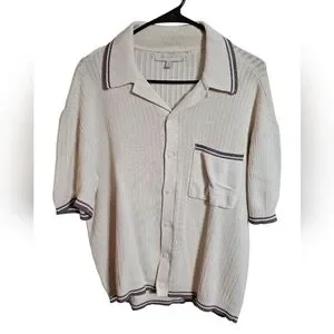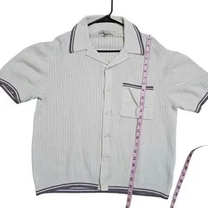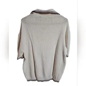 Urban Outfitters Standard Cloth men’s short sleeve knit polo in cream with contrast stripe trim. Textured vertical knit with button front and chest pocket detail. Relaxed oversized fit with soft 100% cotton construction.