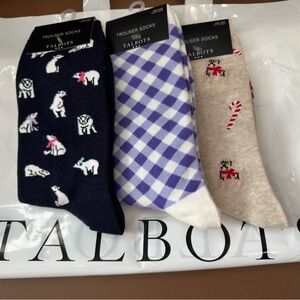 Stylish Talbots socks with playful patterns. Includes black with animal print, purple checkered, and beige with festive design. Perfect for any occasion.