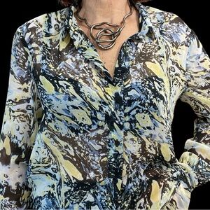 Elegant Blue, Yellow and Black Abstract Print Button Down Shirt EUC MEDIUM