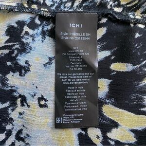 Discover elegance with this stunning abstract print button down shirt. Featuring a captivating blend of blue, yellow, and black this top is perfect for adding a touch of sophistication to your wardrobe.