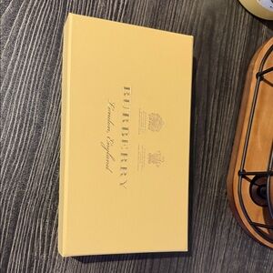 Elegant Burberry scarf with a plaid design. Features tan, black, and red accents. 51% wool/49%silk.