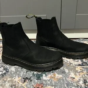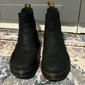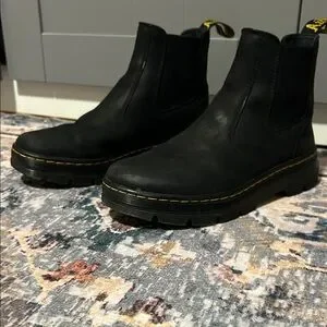 Sleek black Chelsea boots by Dr. Martens. Iconic yellow stitching. Easy slip-on style.