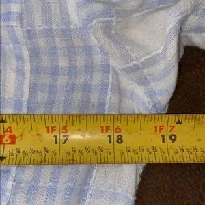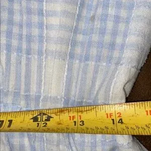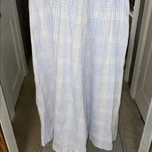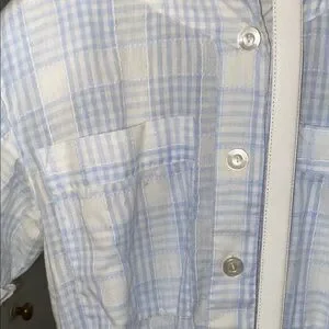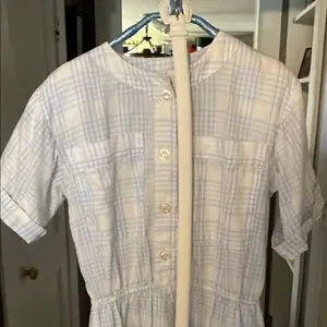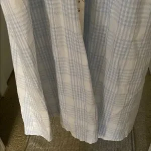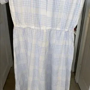 Chic light blue plaid dress with button-up front. Short sleeves and knee-length design.