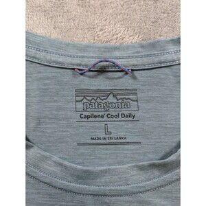 Patagonia Capilene Cool Daily mens size Large blue long sleeve shirt featuring lightweight moisture-wicking performance fabric and classic crew neck pullover design. Built for comfort and versatility, this technical shirt is ideal for hiking, outdoor adventures, travel, workouts, or everyday athleisure wear. The breathable quick-dry material provides all-day comfort while the clean minimalist style pairs easily with shorts or pants for active or casual use.